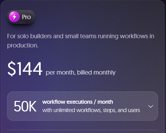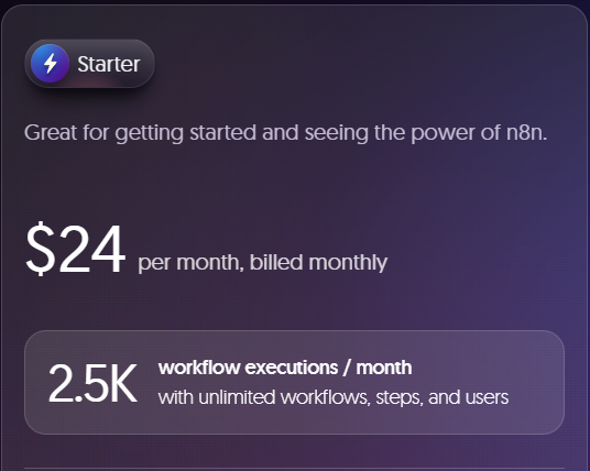 Yes. Starting off with n8n, they do have a starter package of $24 per month, with 2.5k workflow executions. 2.5k to 50k, between the Starter plan and the Pro plan.