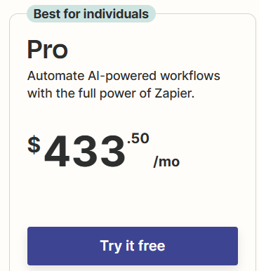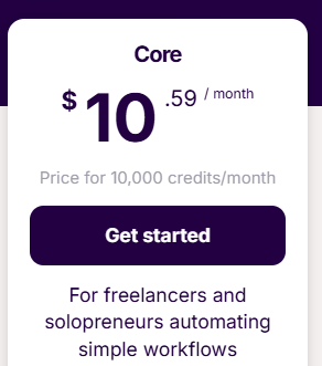 For Make, at the minimum you are paying for 10,000 credits at $10.59 per month. If you're doing the 2,500 tasks per month, at 83 tasks per day, with each task taking 3 credits, you're going to be using 7,470 credits. But lets say we're being fancy and we're doing 4 steps per automation. We can match the 2.5k tasks of n8n, and Zapier. That's still... $10.59 per month.