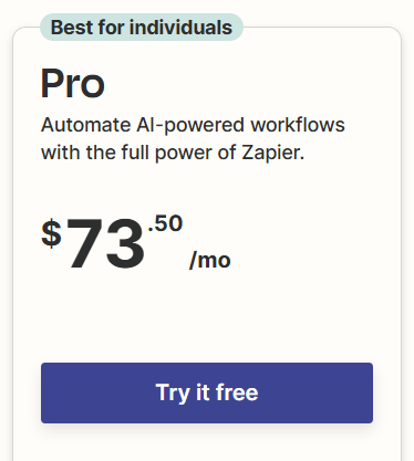 Zapier shows the price between 2,000 tasks and 5,000 tasks. For both, it's still more expensive than n8n. At 2,000 tasks per month, that's $73.50. 5,000 tasks per month? $133.50.
