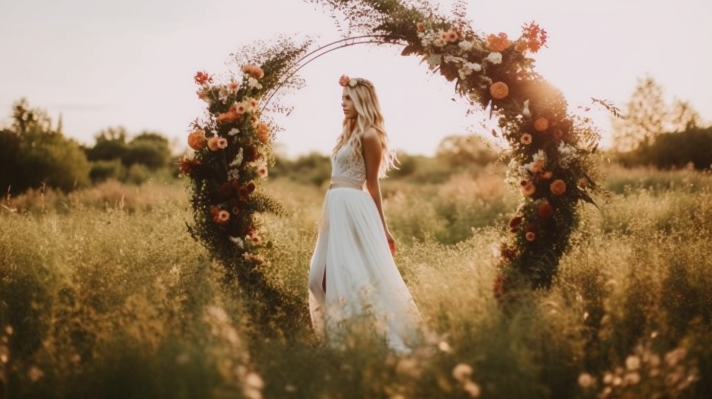 Imagine a rustic outdoor wedding setting, with a floral archway standing as the main attraction for a floral company's ad. The keywords are rustic, natural, whimsical, enchanting, and organic. The camera is a Sony A7R IV mirrorless for its high resolution and dynamic range. The lens is a Sony FE 16-35mm f/2.8 GM, capturing the wide scene in all its beauty. The time of day is sunset, with the sky's warm hues complementing the floral colors. The style is a blend of rustic charm and fairytale whimsy, evoking a sense of enchantment. The camera settings are ISO 100, f/2.8 aperture, and a shutter speed of 1/100. Post-processing techniques include enhancing the warm tones of the sunset and adding a soft focus effect for a dreamy ambiance.