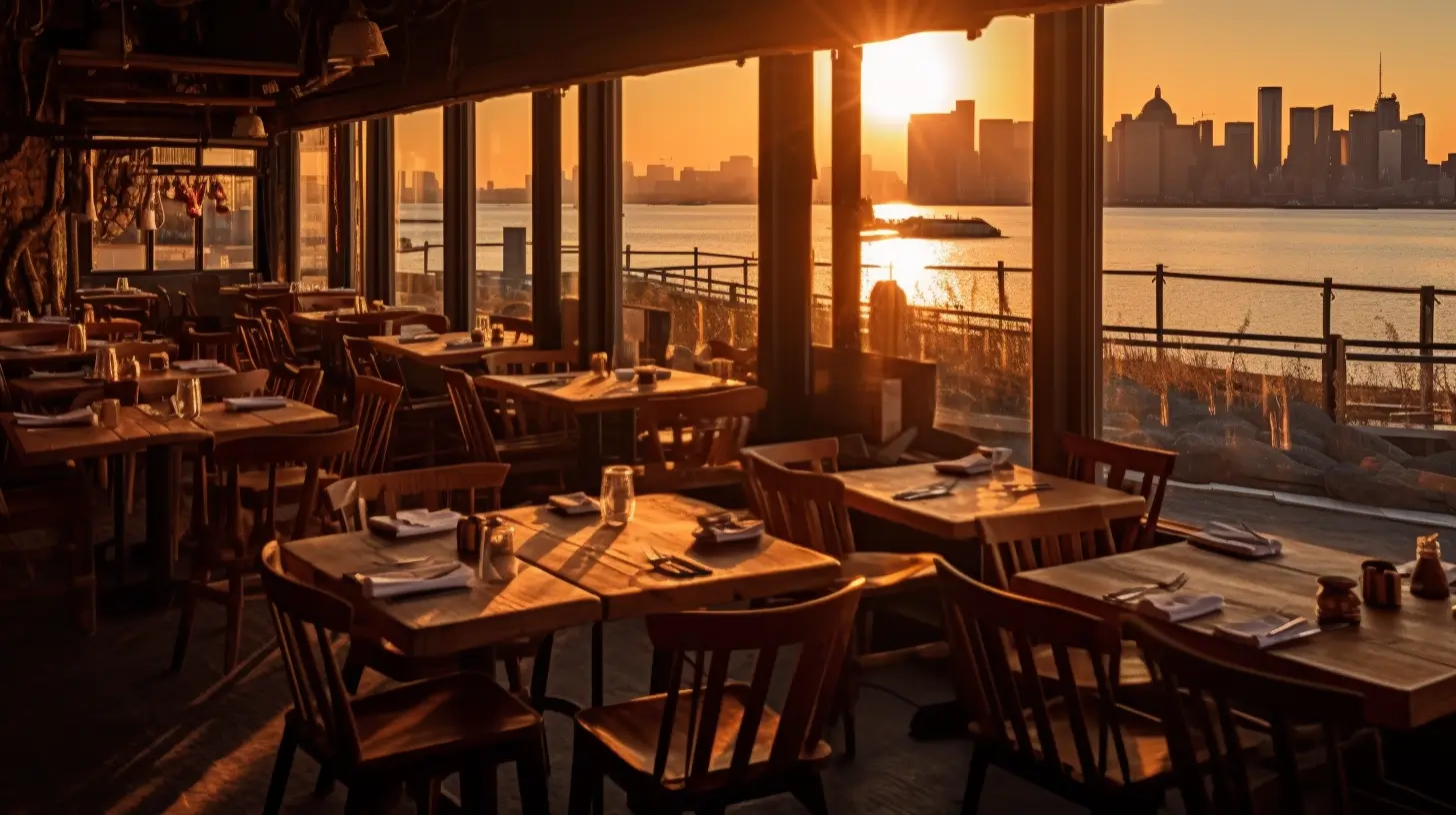 Picture an empty restaurant by the water, the setting sun casting long shadows and bathing everything in a warm, golden light. The restaurant, with its rustic charm and wooden architecture, stands in stark contrast to the modern city skyline visible in the distance. The tables are set, the chairs are neatly arranged, but there's not a soul in sight. The water nearby is calm, reflecting the colors of the sunset. Use a Nikon D850 DSLR camera with a 24-70mm f/2.8 lens to capture this scene. The camera settings should be an ISO of 100, a shutter speed of 1/125, and an aperture of f/8. Post processing should enhance the warm tones and bring out the details in the shadows.