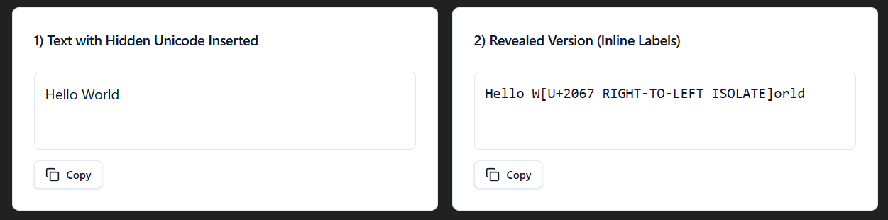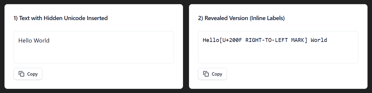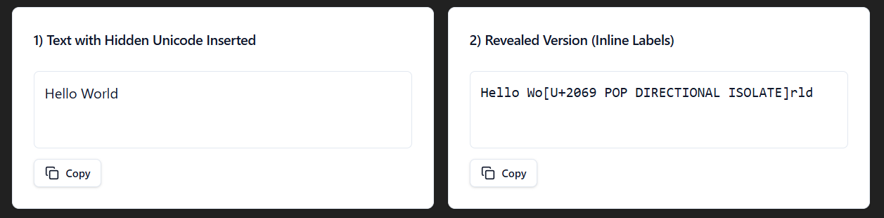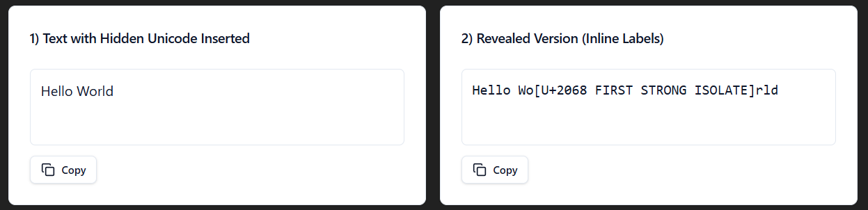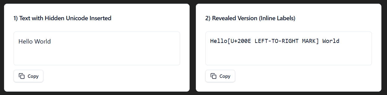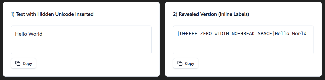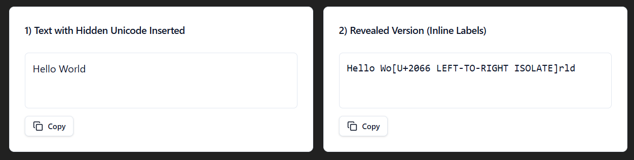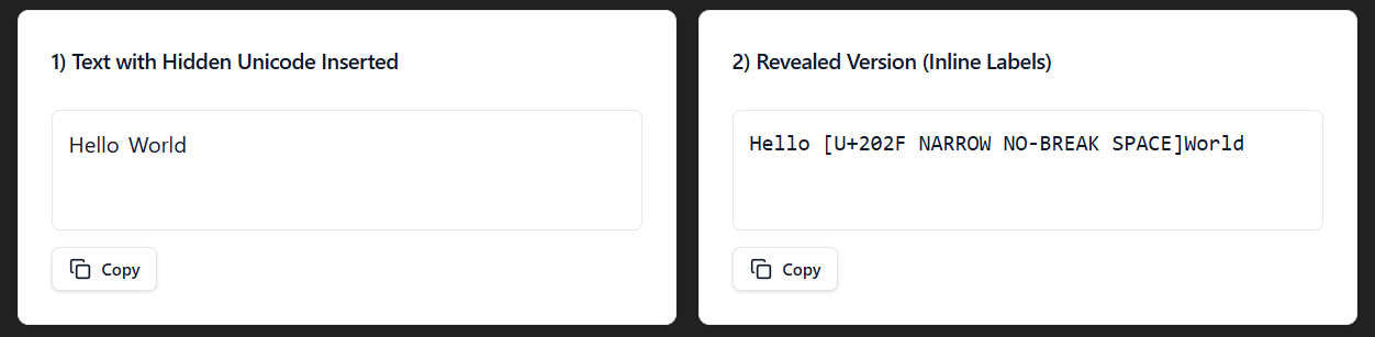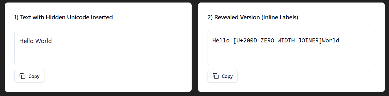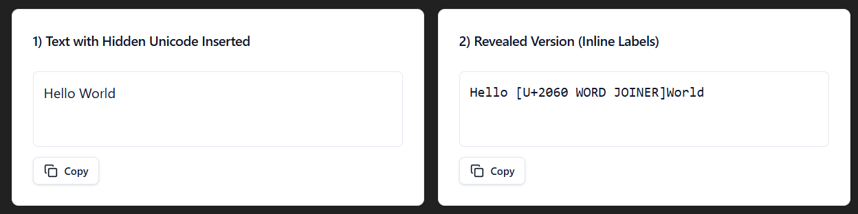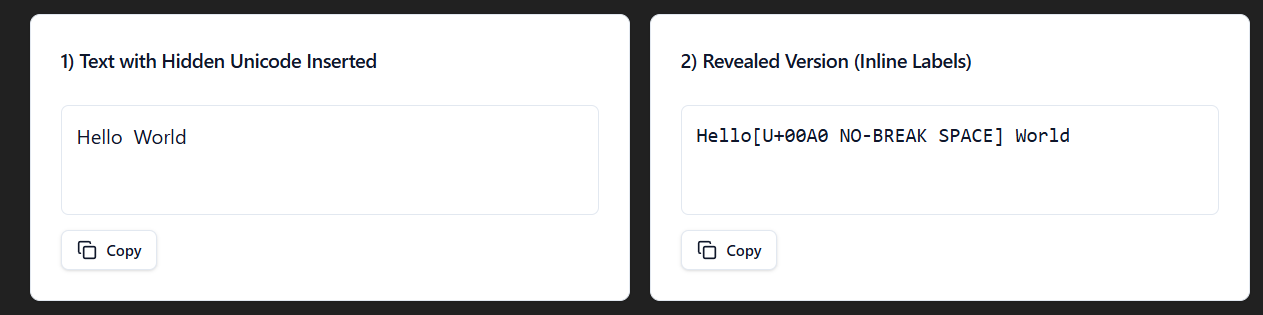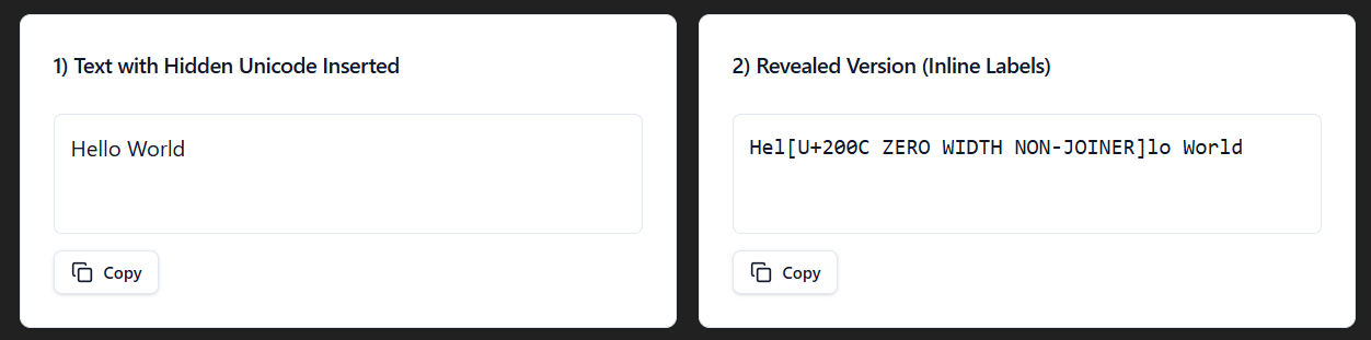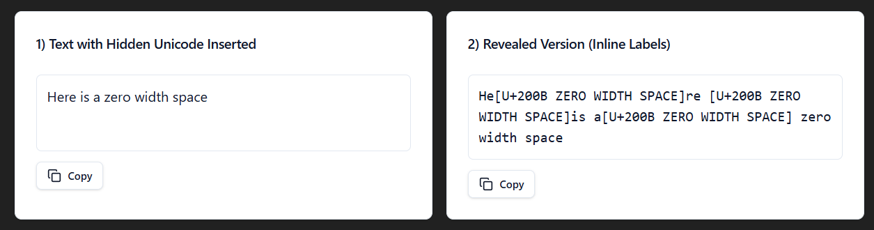 To show the different invisible characters, I made a react app within ChatGPT. You can use my prompt to create your own, just turn on canvas and hit send.